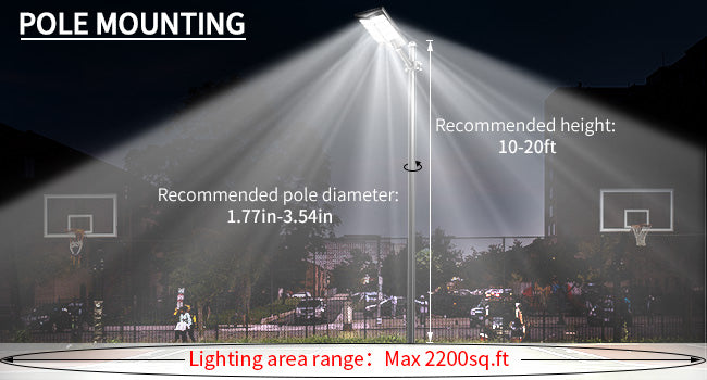 The recommended installation height: is 16ft-20ft. The illumination coverage is up to 2200sq.ft.