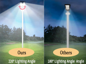Compared with others, Gefolly outdoor solar street light is designed with 220 degrees super wide-angle lighting angle and solar panel and lamp 2 in 1, made of 25% high conversion rate solar panel and 256pcs ultra-bright LED beads, 1 pc Gefolly highlight LED beads =10 pcs other LED beads. Equipped with a 30000mAh large capacity battery, which can provide longer-lasting light and wider range lighting area. The illumination coverage is up to 2000-2200sq.ft.