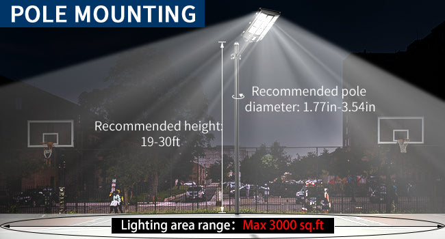 The adviced diameter of the pole is between 1.77in-3.54in.The adviced installation height: 10ft-26ft