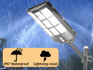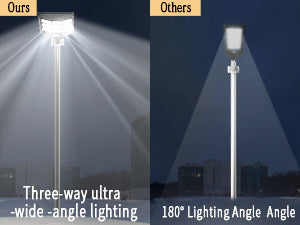 Compared with others, Gefolly outdoor solar street light is designed with a three-way ultra -wide lighting angle and solar panel and lamp 2 in 1, made of 25% high conversion rate solar panel and 324pcs ultra-bright LED beads, 1 pc Gefolly highlight LED beads =20 pcs other LED beads. Equipped with a 30000mAh large capacity battery, which can provide longer-lasting light and wider range lighting area. The illumination coverage is up to 3000sq.ft.