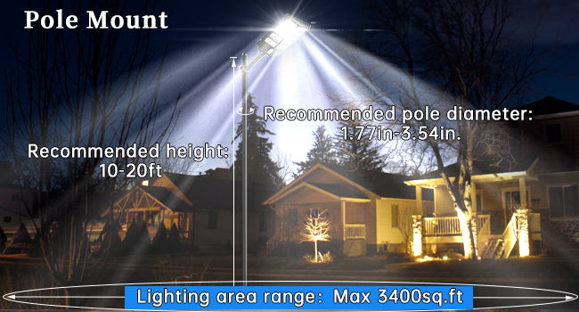 The recommended installation height: is 10ft-20ft. The illumination coverage is up to 3400sq.ft.