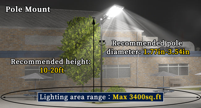 The recommended installation height: is 10ft-20ft. The illumination coverage is up to 3400sq.ft.