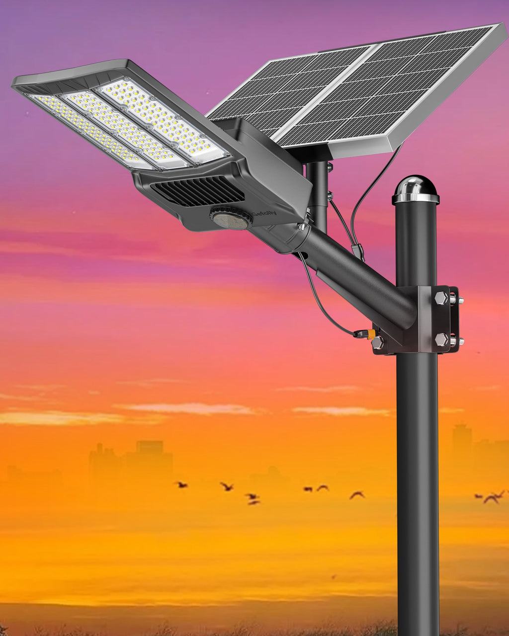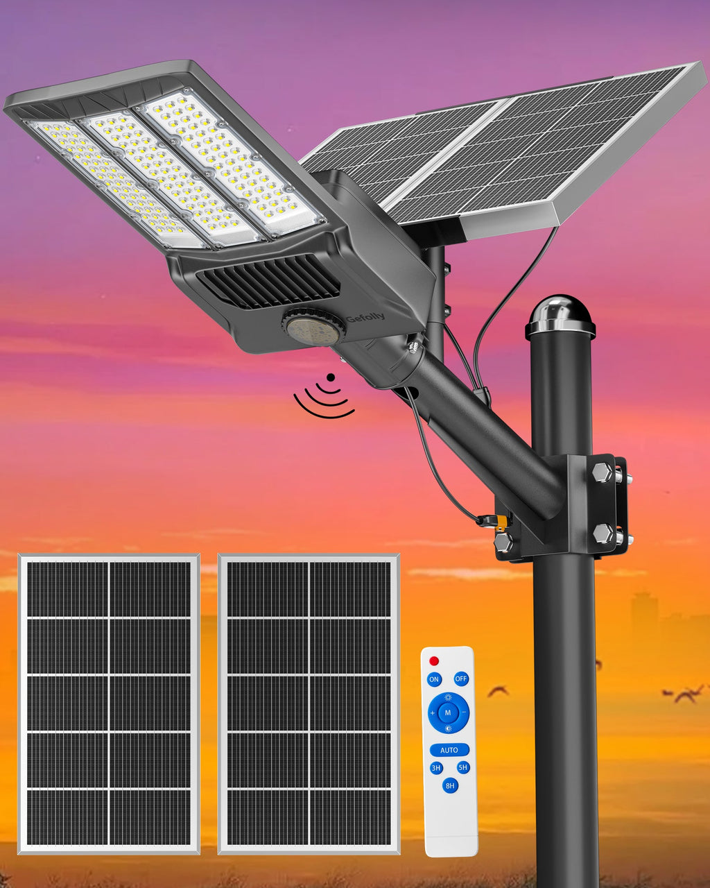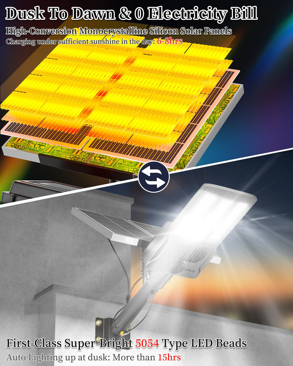 - [Solar Powered & No Electricity Bill] - Gefolly SL-12000W The solar street light is built-in 144pcs 5054 ultra bright LED lamp beads and 3.2v 60000mAh battery (lifetime up to 60,000 hours). Provides a 6500K, IP67 waterproof rating, and works normally even in bad weather all year round. Solar powered, no electricity bill, auto turns on at dusk and charging during the day, Continuous lighting up to 30 hours (when fully charged). Best for commercial and home lighting. Note: The remote controls that come with the light are available in white and black. The white and black remote controls are shipped randomly.